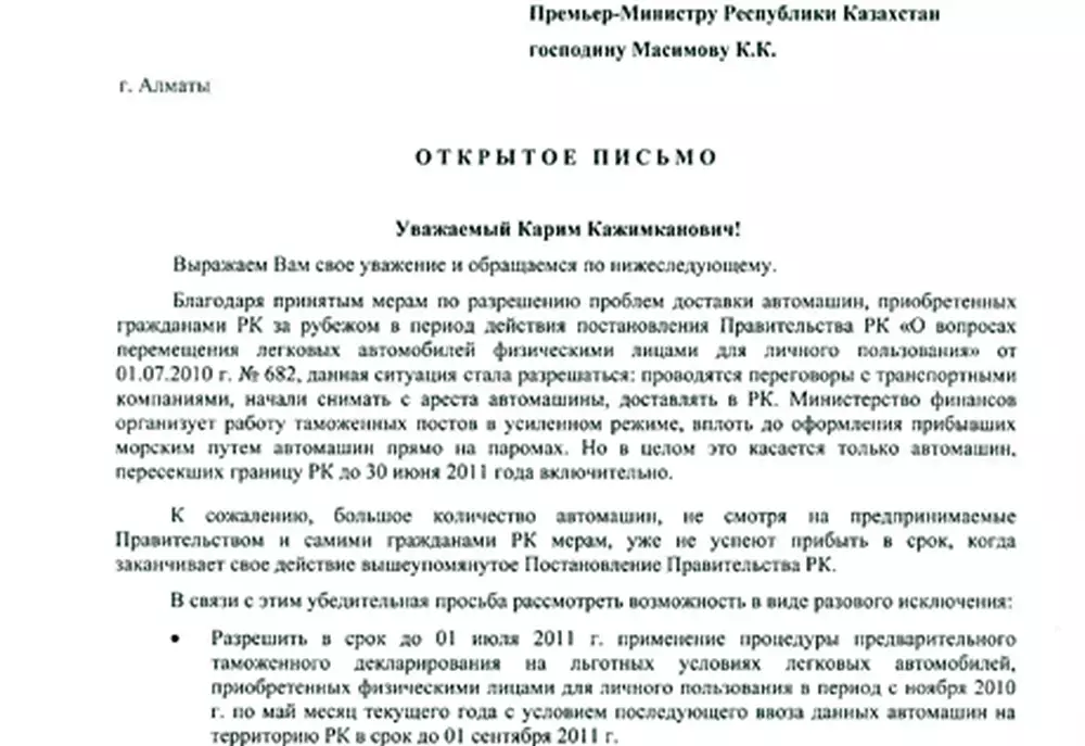 Помимо этого, в письме сказано: "Для решения данного вопроса создать межведомственную комиссию соответствующих государственных органов РК с включением в ее состав граждан из инициативной группы и определить механизм рассмотрения заявлений граждан РК на таможенную очистку автомобилей путем их предварительного декларирования".