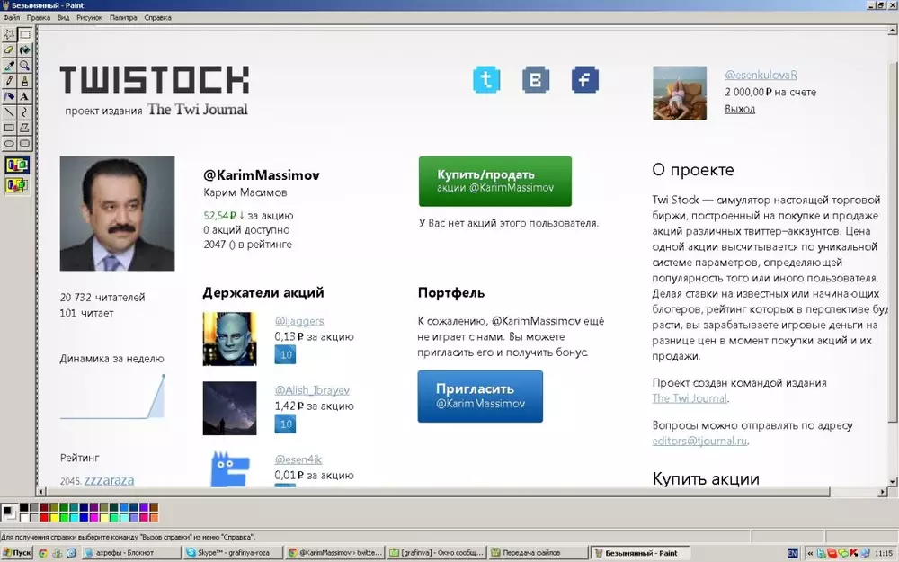 Казахстанские пользователи микроблога Twitter "купили акции" премьер-министра страны Карима Масимова, сообщает корреспондент Tengrinews.kz. Микроблогеры играют на виртуальной бирже, приобретая наиболее перспективные на их взгляд акции пользователей. Проект Twi Stock стал популярным и в Казахстане.