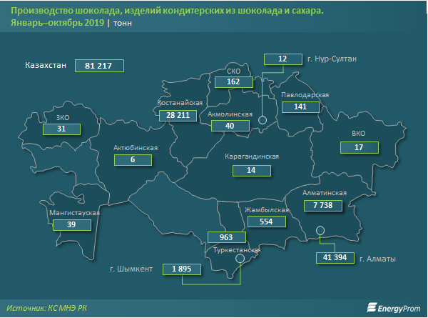 Более половины всего произведенного шоколада и изделий приходится на Алматы - 41,4 тысячи тонн. На втором месте Костанайская область. Здесь сделали 28,2 тысячи тонн изделий, что составляет более трети от всего объема производства. На остальные регионы приходится чуть более 14 процентов от всего выпуска шоколада и кондитерских изделий в стране.