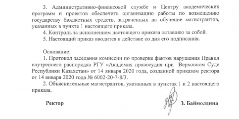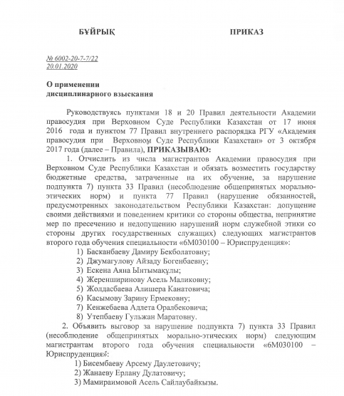 Согласно приказу, опубликованному 20 января на сайте Академии правосудия при Верховном суде Казахстана, из числа магистрантов второго курса отчислены Басканбаева Дамира Бекболатовна, Джумагулова Айзада Богенбаевна, Ескен Аян Ынтымақұлы, Жеренширинова Асель Маликовна, Жолдасбаев Алишер Канатович, Касымова Зарина Ермековна, Кенжебаев Адлет Оралбекович, Утепбаева Гульжан Маратовна.