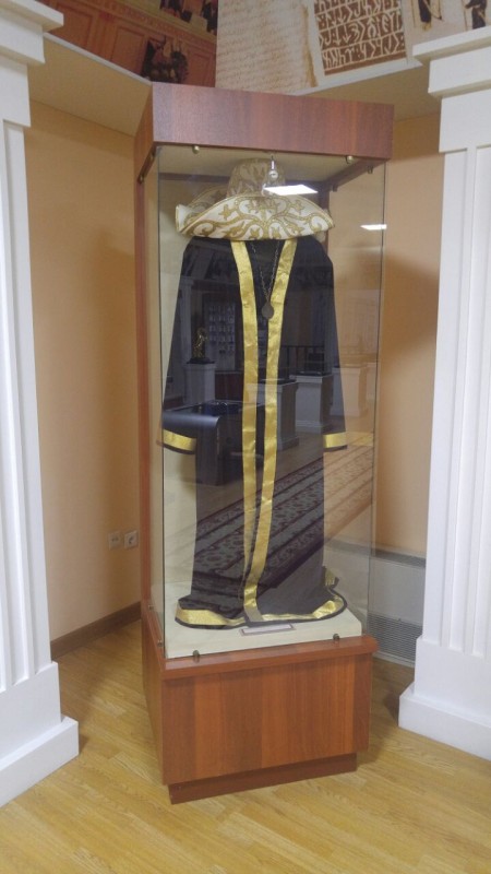 Так выглядели чапан казахского бия и нагрудный знак судебного бия в форме крупного медальона. Нагрудный знак носили на толстой цепочке, он являлся символом особого статуса. В Музее истории права выставлены копии печатей, нагрудных знаков ханов, султанов и биев.