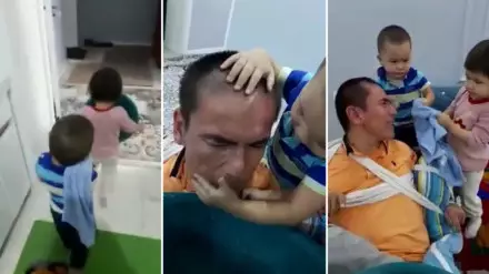 В социальной сети Facebook получило распространение видео, на котором 3-летние двойняшки - мальчик и девочка - ухаживают за своим отцом-инвалидом, передает корреспондент Tengrinews.kz.