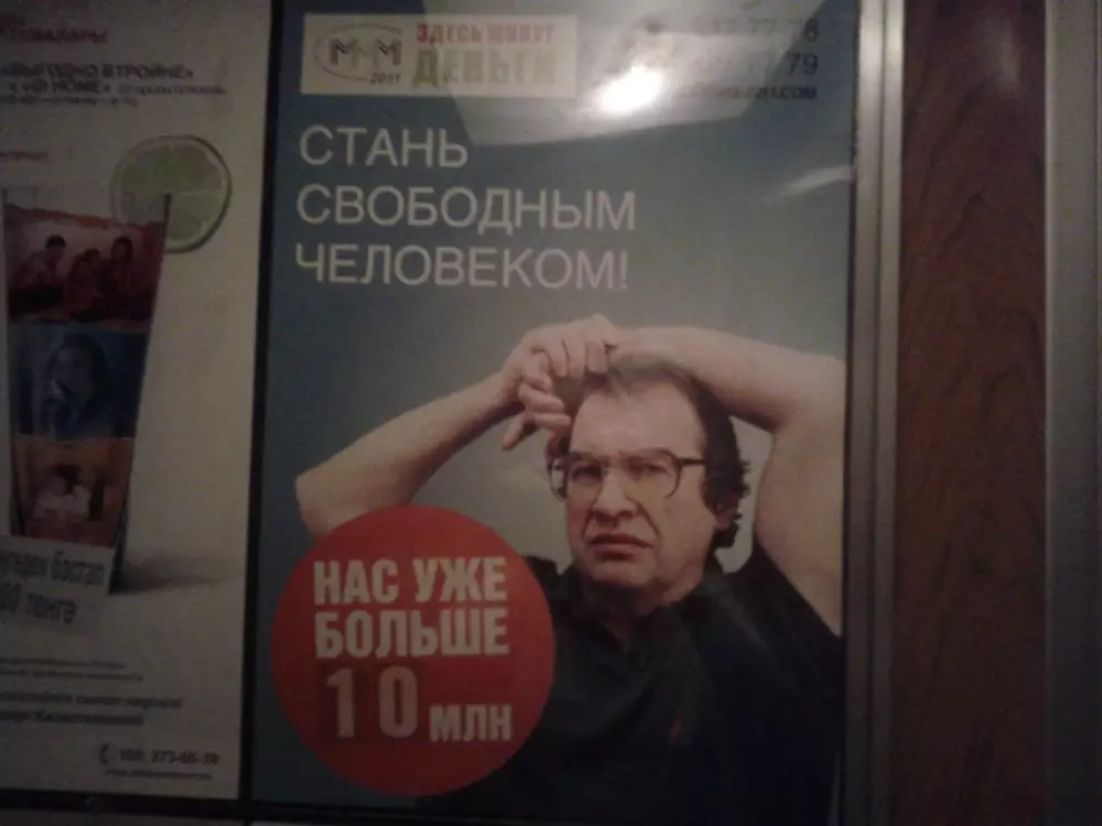 Напомним, в Павлодаре рекламные плакаты "МММ-2011" были размещены на трамваях. Постерами обклеили чуть ли не все вагоны. А в Алматы похожие плакаты появились в лифтах жилых многоэтажных домов.