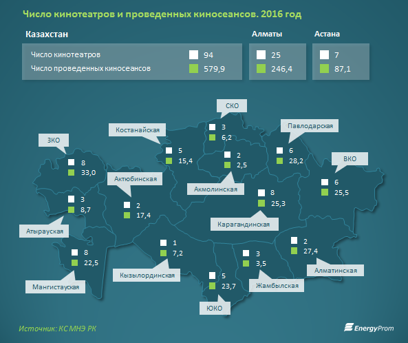 В целом по стране к началу текущего года казахстанцам оказывали услуги 94 кинотеатра (против 93 в 2015 году). В прошлом году в них провели 579,9 тысячи киносеансов - на 11,5 процента больше, чем годом ранее.