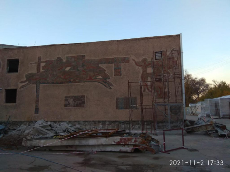 В "Целинном также сообщили, что выполняется демонтаж стены с репликой сграффито Евгения Сидоркина. Основную стену со сграффито, которая подлежит усилению, демонтировали успешно, крупными блоками для последующей реставрации после установки на прежнюю ось.