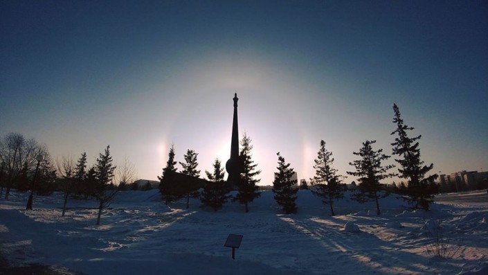 Помимо шуток в Facebook и инея на бровях прохожих, усилившиеся морозы принесли в Астану и очень красивое явление - солнечное гало.