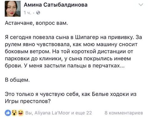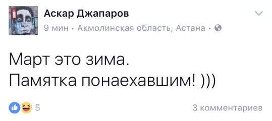 "Для всех алматинцев я говорю и хочу показать условия работы в Астане. Нереальный снег, на улице минус 21 градус и жуткий ветер", - пугает жителей южных регионов пользователь Facebook Арсен Шакуов, добавляя, что его лучшим другом в Астане стала теплая шапка.