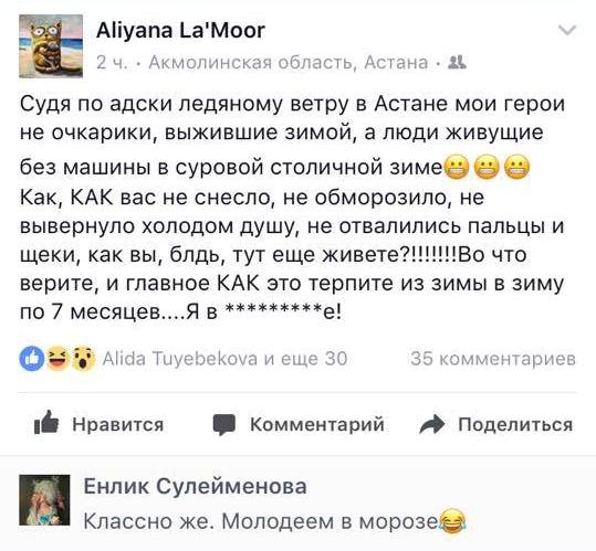 Пользователи Казнета не обошли вниманием укрепившиеся морозы в Астане. Жители и гости столицы публикуют в Сети шутки, жалобы и свои физические эксперименты, передает корреспондент Tengrinews.kz.