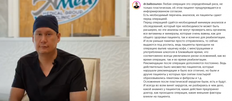 Пять дней назад доктор Байбосунов написал пост в своем Instagram. Он отметил, что при любой операции есть риск, о котором всегда предупреждают всех клиентов. В беседе с корреспондентом Tengrinews.kz пластический хирург заявил, что операции всем женщинам он провел правильно. Но не все клиентки, по его словам, соблюдали договорные обязательства и рекомендации.