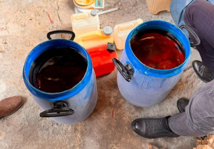 В лаборатории было изъято порядка 5 килограммов готового и 350 литров жидкого психотропного вещества a-PVP, а также 800 литров прекурсоров и лабораторное оборудование для изготовления наркотиков.