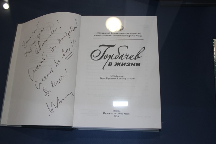Также есть книга от первого президента СССР Михаила Горбачева "Горбачев в жизни". Автор оставил автограф в книге и подписал ее следующим образом "Дорогой Нурсултан Абишевич! Спасибо за все! До встречи".