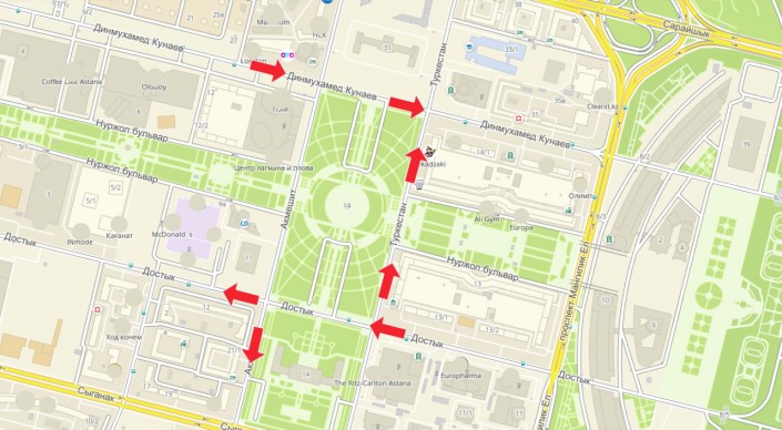 "Улицы Туркестан и Акмешит, Кунаева и Достык - эти четыре улицы с односторонним движением мы будем запускать до Дня города. Туркестан будет (односторонней) в направлении улицы Сарайшык, Акмешит - вверх в сторону аэропорта. Улица Кунаева будет в направлении Дома министерств, а Достык - в сторону ТРЦ "Хан Шатыр", - сообщил руководитель Управления транспорта и развития дорожно-транспортной инфраструктуры Астаны Асхат Карагойшин.