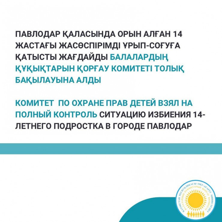Комитет по охране детей взял на полный контроль дело о групповом избиении подростка в Павлодаре. Сообщение об этом появилось на странице ведомства в Facebook, передает Tengrinews.kz.