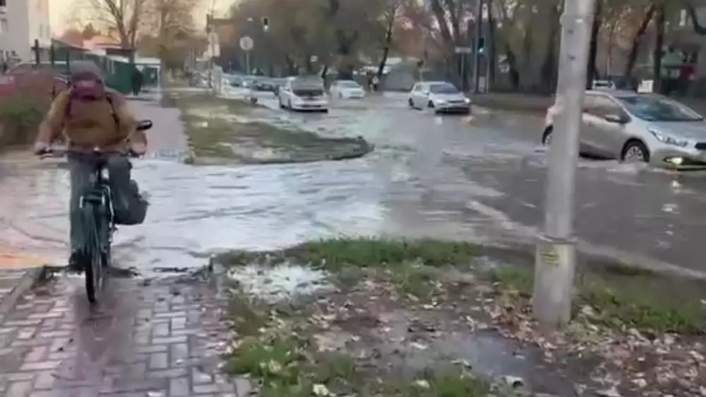 Фонтан забил из-под земли в центре Алматы на пересечении улиц Шарипова и Гоголя. Инцидент произошел 10 ноября.
