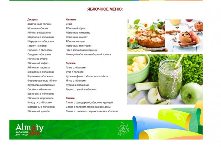 В честь Дня города акимат Алматы объявил конкурс среди ресторанов и кафе на создание лучшего яблочного меню, передает Tengrinews.kz.