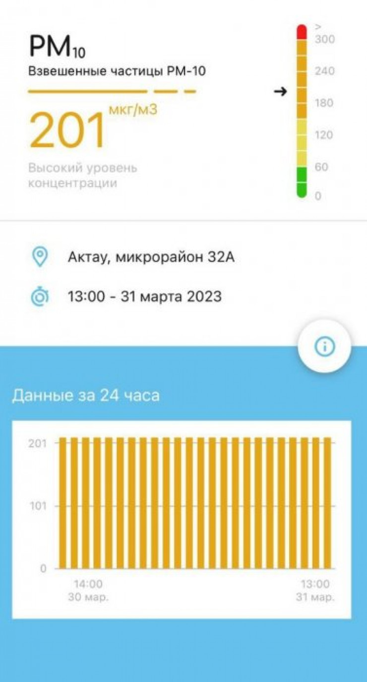 По данным другого ресурса iqair.com, концентрация PM2.5 в Актау сейчас в 4,7 раза выше рекомендуемого ВОЗ среднегодового значения качества воздуха. А в соцсетях жители делятся данными с мобильного приложения Airkaz, сделанными в разное время.