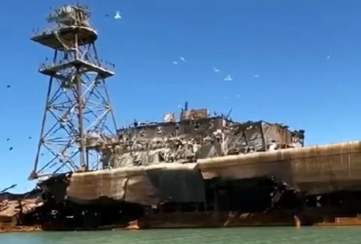 В социальных сетях публикуются видеозаписи, на которых запечатлено старое заброшенное судно, находящееся в море. На кадрах хорошо видно, как сильно корабль проржавел. Автор ролика говорит, что это знаменитый корабль времен второй мировой войны, который теперь гниет и распадается на части.