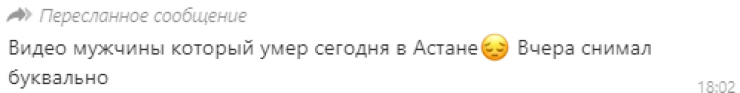 WhatsApp мессенджерінде осы видеомен бірге бір жазба тараған: "Бүгін Астанада қайтыс болған ер адамның видеосы. Кеше ғана түсірген".