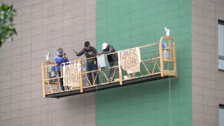 Инцидент произошел накануне в одной из строящихся многоэтажек. Трое мужчин поднялись на фасадном подъемнике, вывесили плакаты и стали выкрикивать свои требования. Правда, из-за сильного ветра и высоты, на которой находились строители, расслышать их было непросто.