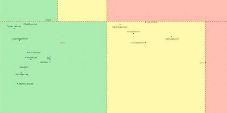 В "зеленой" зоне: Алматы, Шымкент, Атырауская, Актюбинская, Алматинская, Западно-Казахстанская, Туркестанская, Жамбылская, Кызылординская, Мангистауская, Восточно-Казахстанская области.