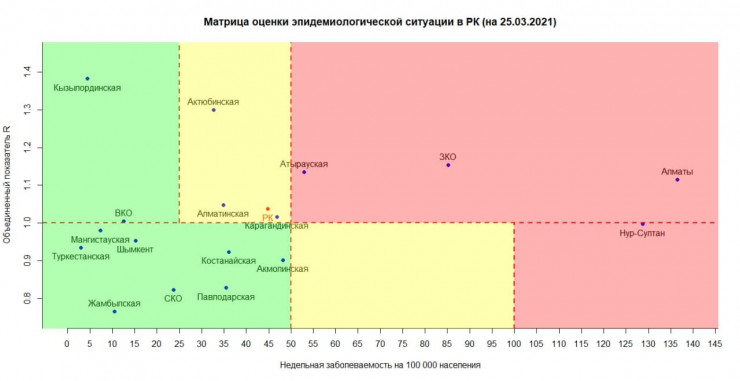 Сообщается, что в "красную" зону 25 марта попала Атырауская область. Здесь за сутки выявлено 65 новых случаев коронавируса, а всего - 18 183.