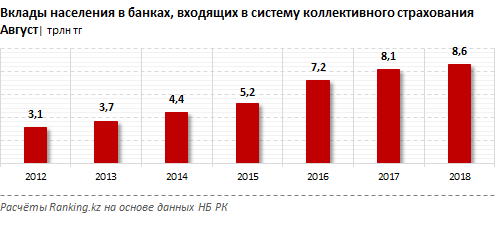 Совокупная сумма вкладов населения в банках, входящих в систему коллективного страхования, на конец августа текущего года составила 8,6 триллиона тенге, что на 483 миллиарда (5,9 процента) больше, чем в прошлом году.