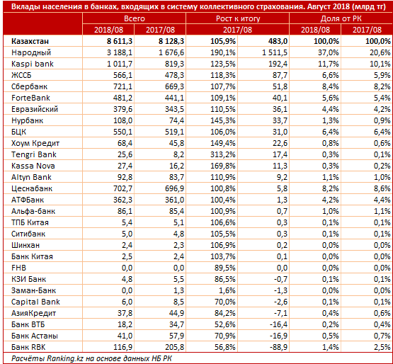 Самый большой рост объема вкладов наблюдался у Народного банка - на 1,5 триллиона тенге (90,1 процента), до 3,2 триллиона тенге. Впрочем, это результат поглощения Казкоммерцбанка. Доля Народного выросла с 20,6 процента до 37 процентов.