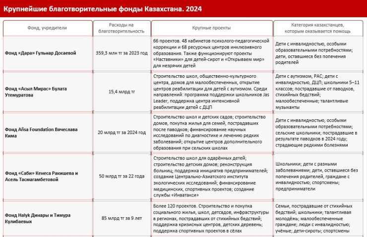 Однако благотворительность - это не только реакция на кризисы. Многие казахстанские фонды системно работают в различных сферах. Они поддерживают молодых ученых, финансируют научные исследования, помогают сохранять культурное наследие.