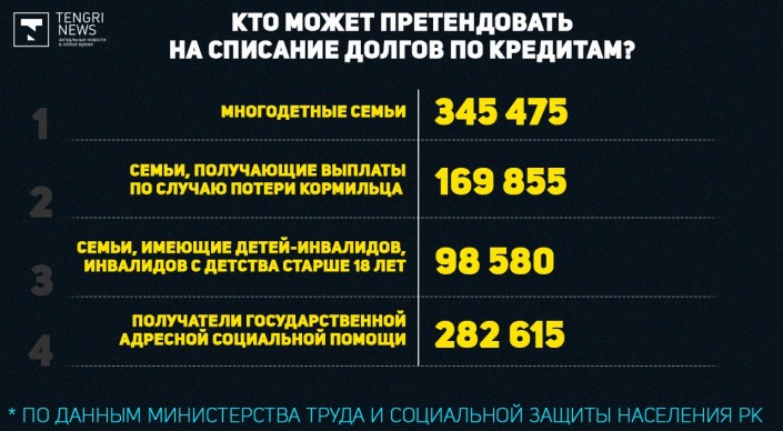 Акорда сообщала, что новым указом планируется охватить порядка 500 тысяч казахстанцев. Долги по кредитам, согласно документу, предполагается списать многодетным семьям, семьям, получающим выплаты по случаю потери кормильца, семьям, имеющим детей-инвалидов, инвалидов с детства старше 18 лет, получателям государственной адресной социальной помощи и детям-сиротам.