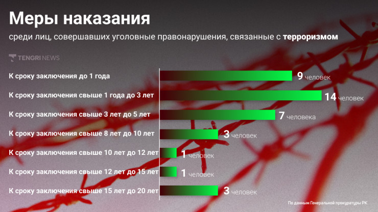 Самой распространенной мерой уголовного наказания за терроризм, по данным комитета, является лишение свободы на срок свыше 5 лет до 8 лет включительно. Такой срок отбывают 22 казахстанца.