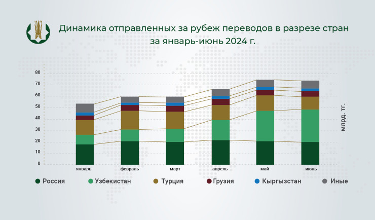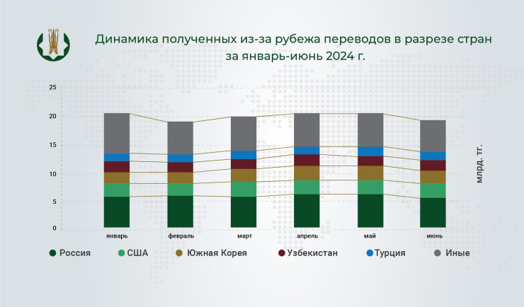 "Совокупный объем переводов денег, проведенных через системы международных денежных переводов (далее – СМДП) за I полугодие 2024 года, составил 515,3 миллиарда тенге, снизившись на 19 процентов по сравнению с показателем за аналогичный период 2023 года", - говорится в сообщении.