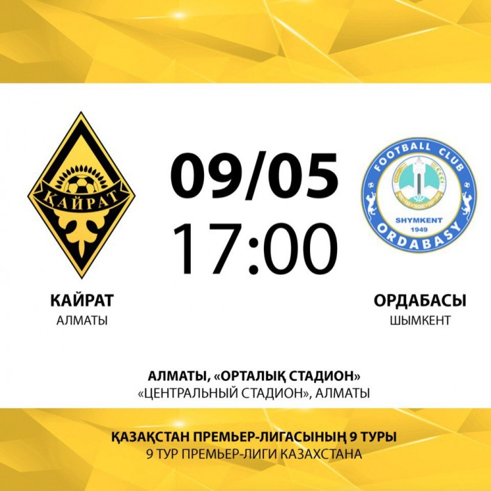 Алматинский "Кайрат" в рамках девятого тура премьер-лиги сезона-2018, встречается с шымкентским футбольным клубом "Ордабасы" на Центральном стадионе.