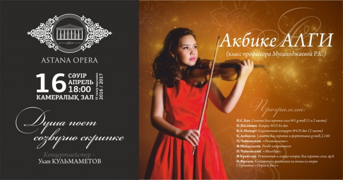 На концерте "Душа поет созвучно скрипке" выступит талантливая казахстанская скрипачка, лауреат международных конкурсов Акбике Алги. Яркое молодое дарование, за короткое время успевшая добиться признания на родине и за рубежом, сыграет для гостей "Астана Опера" известные произведения Баха, Паганини, Моцарта, Дебюсси, Чайковского, Мендельсона и других классиков.