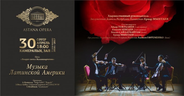 Концерт известного коллектива - Государственного струнного квартета имени Газизы Жубановой - пройдет в камерном зале "Астана Опера" в рамках цикла "Вокруг света с Казахквартетом". На этот раз музыканты представят музыку композиторов стран Латинской Америки. Квартет отличает высокое исполнительское мастерство, филигранная техника игры, чистое, слаженное звучание, которого добиваются не только благодаря таланту, но и бесконечной кропотливой работой.