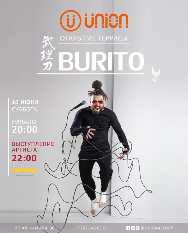 В Алматы состоится открытие нашумевшей террасы Union. Главным музыкальным подарком станет выступление популярной российской топ-группы - Burito. Также, по заверениям организаторов, гостей ожидают зажигательные сеты от популярных диджеев, масса сюрпризов, незабываемая шоу-программа и прекрасное настроение.