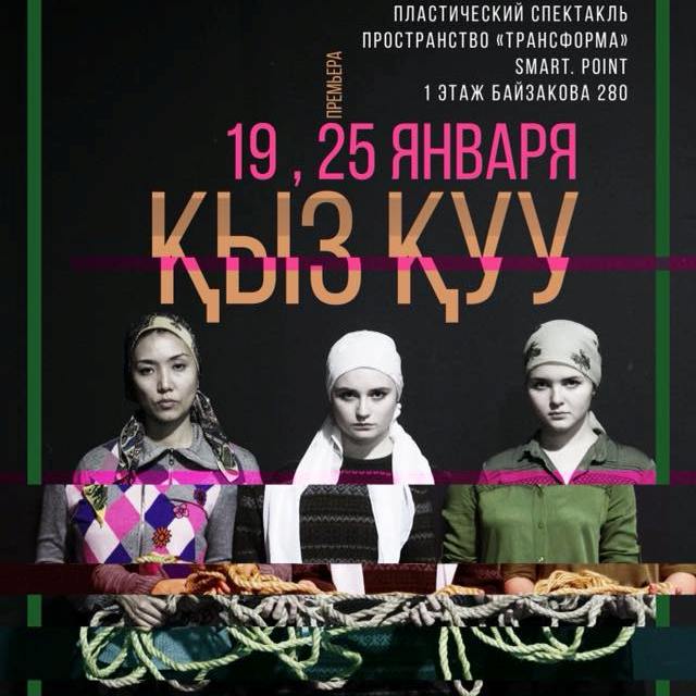Пространство "Трансформа" (улица Байзакова, 280) представляет пластический спектакль "Кыз Куу" - историю о девушке, которую украли и выдали замуж против ее воли. Основан на реальных историях. В спектакле использована музыка казахстанской группы ударных инструментов BugaraBu.