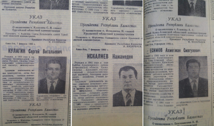 8 февраля 1992 года указами Президента назначены главами областных администраций Алматинской области - Ахметжан Есимов, Восточно-Казахстанской - Амангельды Бектемисов, Жезказганской - Григорий Юрченко, Кзыл-Ординской - Сеилбек Шаухаманов, Кокшетауской - Жаныбек Карибжанов, Павлодарской - Асыгат Жабагин. Алматинскую городскую администрацию возглавил Заманбек Нуркадилов.