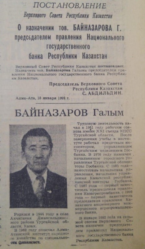 18 января 1992 года в газете "Казахстанская правда" вышла заметка о назначении Галыма Байназарова председателем правления Национального государственного банка Республики Казахстан.
