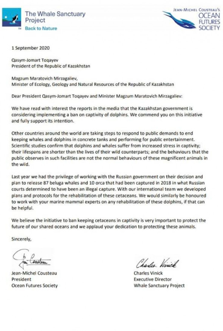 "Мы с интересом прочитали сообщения в СМИ о том, что правительство Казахстана рассматривает возможность введения запрета на содержание дельфинов в неволе. Мы благодарим вас за эту инициативу и полностью поддерживаем ее намерение.