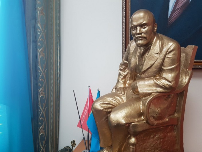 Между флагом Казахстана и знаменем Коммунистической народной партии - статуэтка Владимира Ильича Ленина, день рождения которого на днях будут отмечать коммунисты по всему миру.