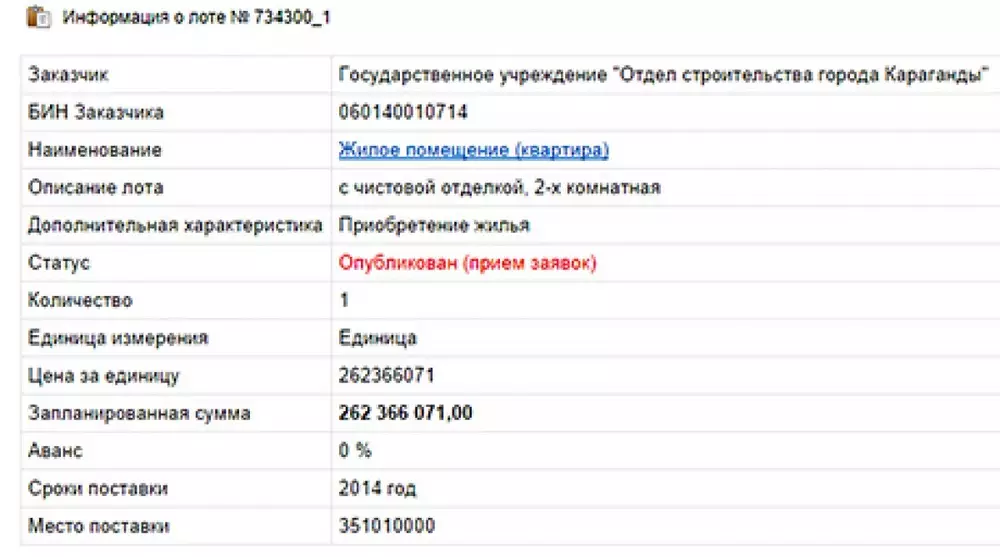 В описании лота указано, что на эту сумму акиматом Караганды приобретается двухкомнатная квартира с чистовой отделкой. Тендер был опубликован на сайте 8 октября 2014 года. Заявки принимаются до 28 октября. Отметим, срок поставки организатор электронного конкурса - городской отдел строительства - указал 2014 год.