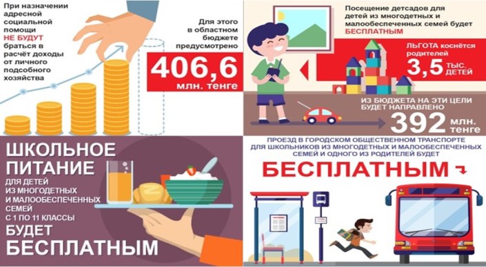 Как рассказал на брифинге заместитель акима области Мейрам Бегентаев, детей из многодетных и малообеспеченных семей обеспечат бесплатным питанием в детских садах и школах, а также проездом в городских автобусах и трамваях. Бесплатно сможет ездить в городском транспорте и один из родителей.