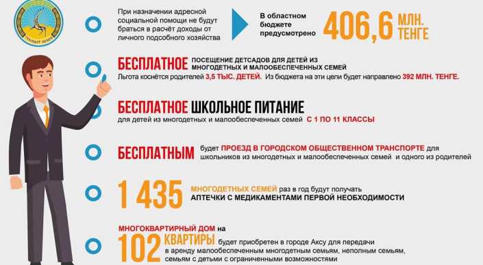 По словам чиновника, на каждую многодетную семью, получающую адресную соцпомощь и попавшую в трудную жизненную ситуацию, создан социальный паспорт. Документ позволил правильно оценить масштабы необходимой помощи и эффективно распределить имеющиеся ресурсы регионального бюджета. В данное время в регионе малообеспеченным и многодетным семьям уже оказывается социальная помощь на общую сумму свыше миллиарда тенге. Дополнительно различные виды социальной поддержки получили свыше полутора тысяч семей на общую сумму 103,5 миллиона тенге.
