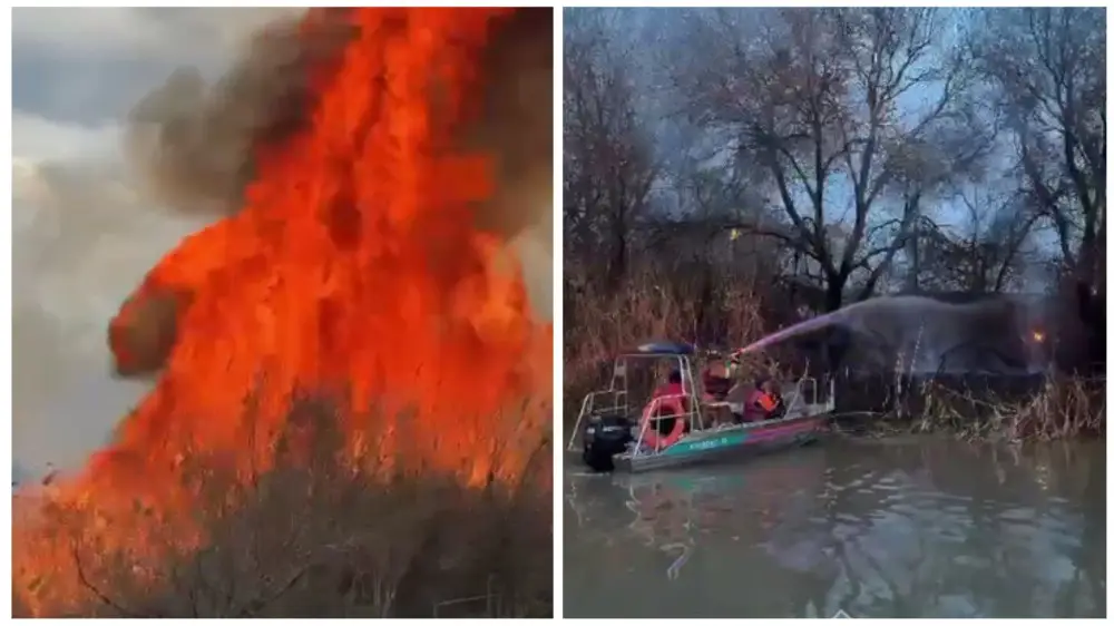 Спасатели задействовали лодки для тушения очагов возгорания вдоль канала, и им удалось оперативно ликвидировать огонь и не допустить распространения огня на расположенные рядом строения.