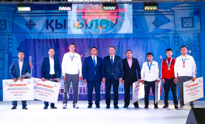Также денежные сертификаты были вручены боксерам, которые прославили Казахстан на мировом чемпионате в российском городе Екатеринбург: Камшыбек Конкабаев получил 2 миллиона тенге, Турсынбай Кулахмет - миллион тенге. Кроме того, серебряный призер чемпионата мира по вольной борьбе Даулет Ниязбеков удостоился сертификата в 2 миллиона тенге. Сертификаты вручены также тренерам спортсменов.