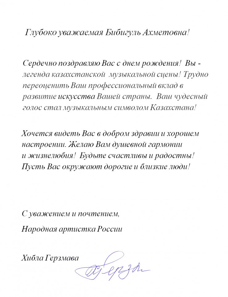 Кроме того, поздравительное письмо направила российская оперная певица Хибла Герзмава.