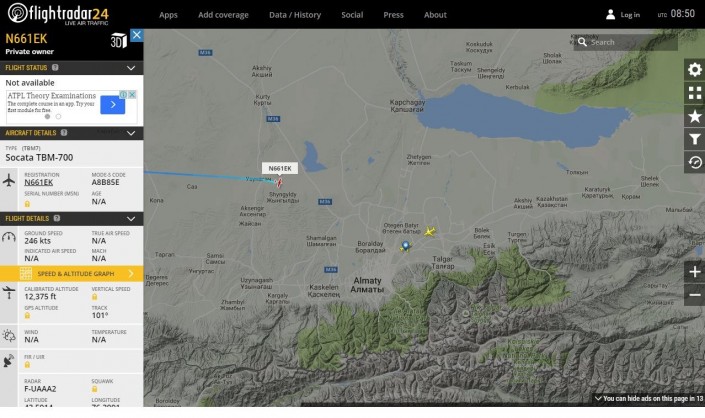 В аэропорту Алматы приземлился одномоторный самолет, совершающий первый в истории Китая кругосветное путешествие, передает корреспондент Tengrinews.kz со ссылкой на сервис Flightradar24.
