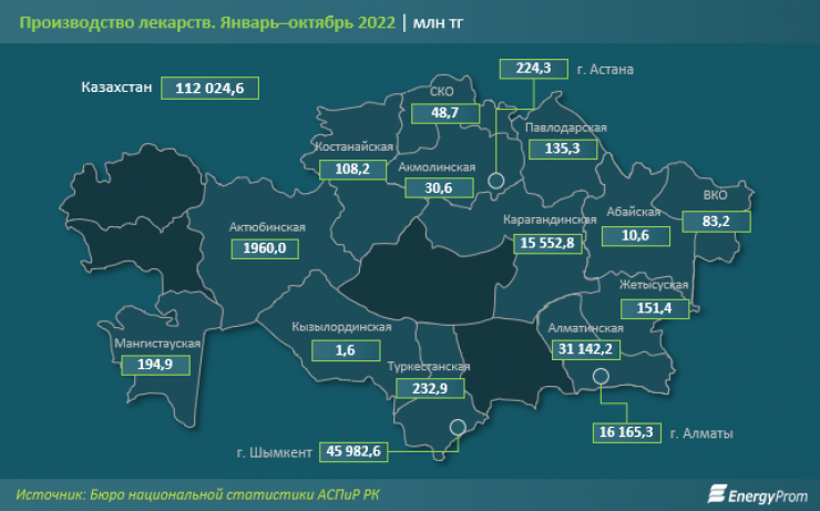 За январь - октябрь текущего года производство лекарств в стране в стоимостном выражении составило 112 миллиарда тенге - на 13,2 процента меньше, чем годом ранее.