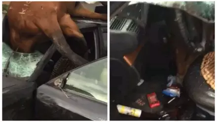 В результате столкновения лошадь пробила лобовое стекло иномарки и погибла. Голова животного оказалась внутри салона, а тело - на крыше машины. О судьбе водителя автомобиля пока ничего неизвестно.
