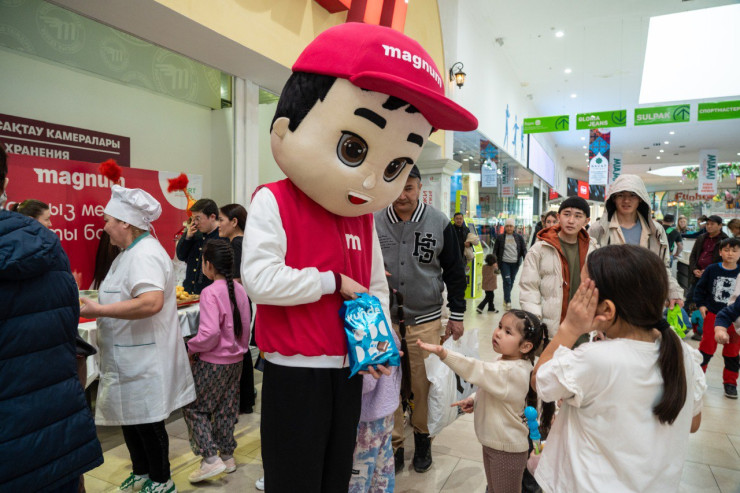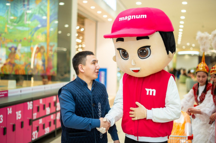 У входа в торговый зал гостей встречали певцы и домбристы. А еще дети и взрослые с удовольствием общались с забавной ростовой куклой в фирменной одежде сотрудника Magnum.